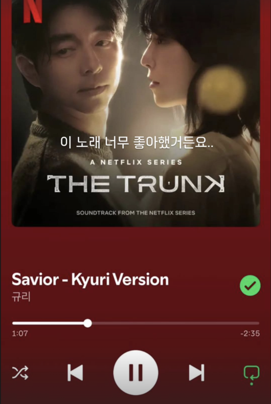 또한 공유는 ‘트렁크’ OST인 ‘Savior’ 재생 화면을 올리며 “이 노래 너무 좋아했거든요”라고 직접 인증을 하기도 했다.