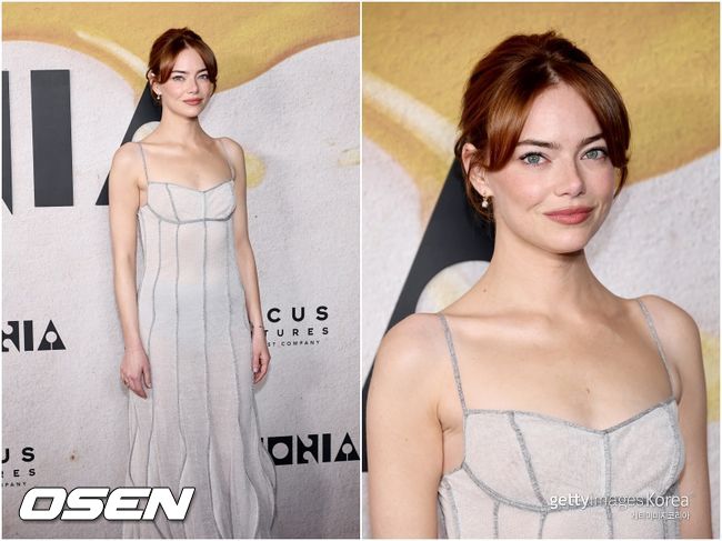 보도에 따르면 21일 미국 뉴욕 현대미술관(MoMA)에서 열린 영화 ‘부고니아’ 프리미어 현장에 등장한 엠마 스톤은 루이비통의 시스루 화이트 가운을 입고 등장했다. 그레이 스티칭이 들어간 드레스는 상체를 타이트하게 잡아주며 풍성한 스커트와 대비를 이루었다.