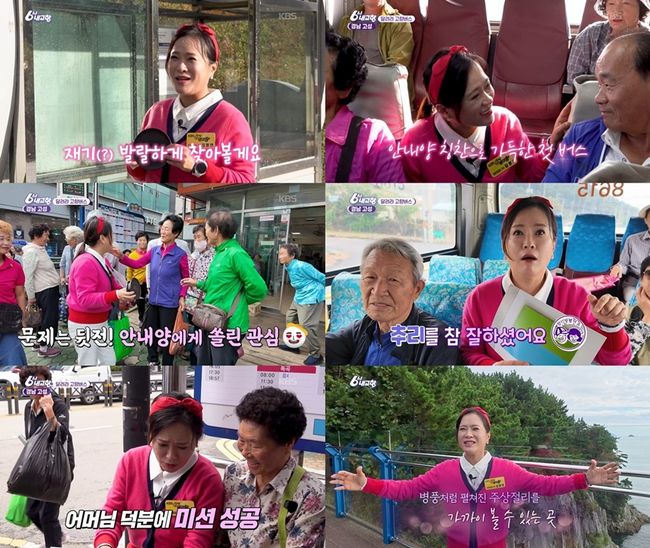 21일 방송된 KBS1 ‘6시 내 고향’에서는 경상남도 고성군의 버스에 올라 이웃들의 인생사를 만나보는 ‘국민 안내양’ 김정연의 모습이 담겼다. 김정연은 “고성하면 우리나라에서 공룡 발자국이 최초로 발견된 지역이지 않냐”고 소개하며 “저도 공룡 못지 않게 어르신들의 사랑을 많이 받고 왔다”는 인사로 시청자들을 웃음짓게 했다.