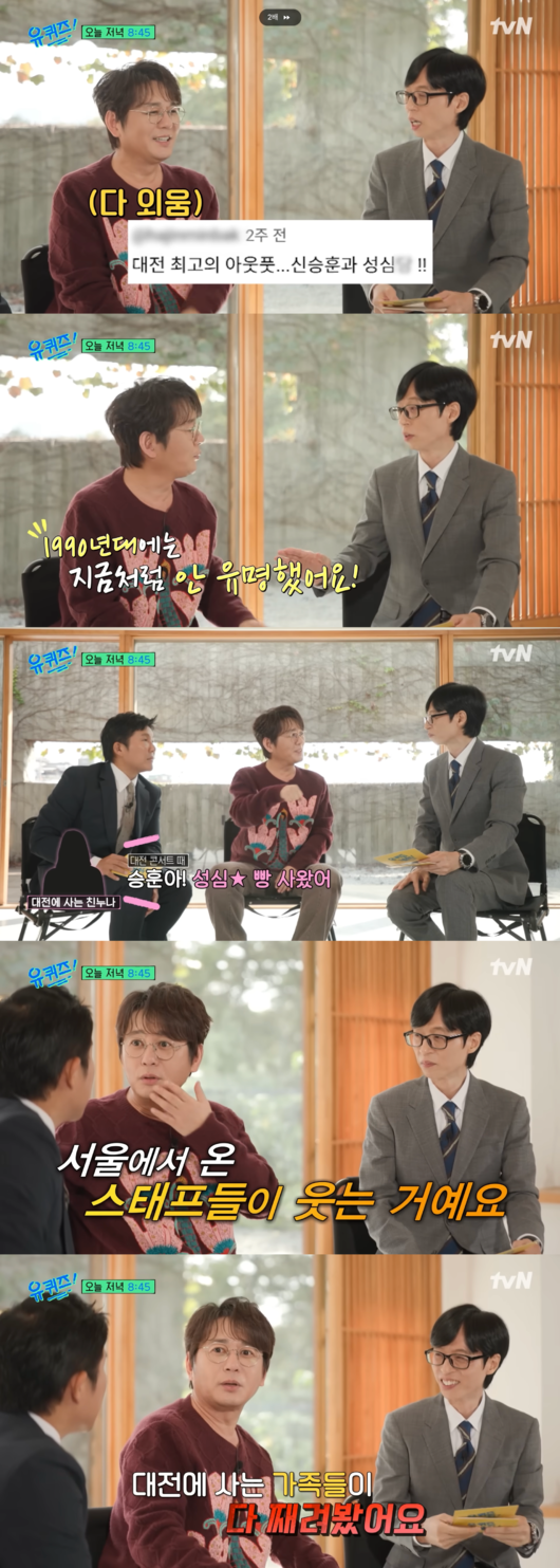 이날 유재석은 “베스트 댓글이 ’우린 잠시 잊고 있었다. 성심당 이전에 대전엔 신승훈이 있었다는 걸’”이라며 대전 출신인 신승훈을 언급했다.