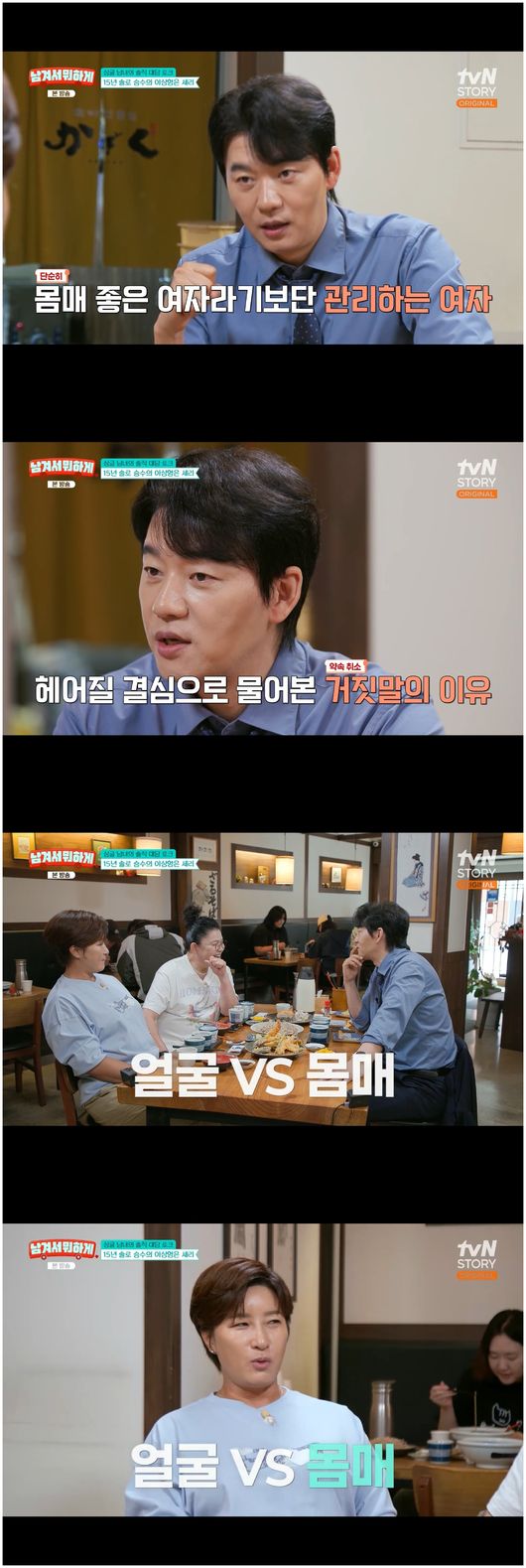 이영자는 “얼굴 예쁜 여자, 몸매 좋은 여자”라며 기습적으로 물었다. 김승수는 “몸매! 관리하는 여자가 좋다. 운동으로 자기 관리로 탄탄한 근육이 있는 여자가 좋다”라고 말했다. 이영자는 “돌려 말하는 여자, 직설적으로 말하는 여자”라고 또 한 번 물었고, 김승수는 “남자들 공통 로망일 거다. 대놓고 얘기해주는 게 좋다”라면서 "다만 저는 데이트 내내 같이 있어야 한다"라고 말해 모두를 놀라게 했다./osen_jin0310@osen.co.kr