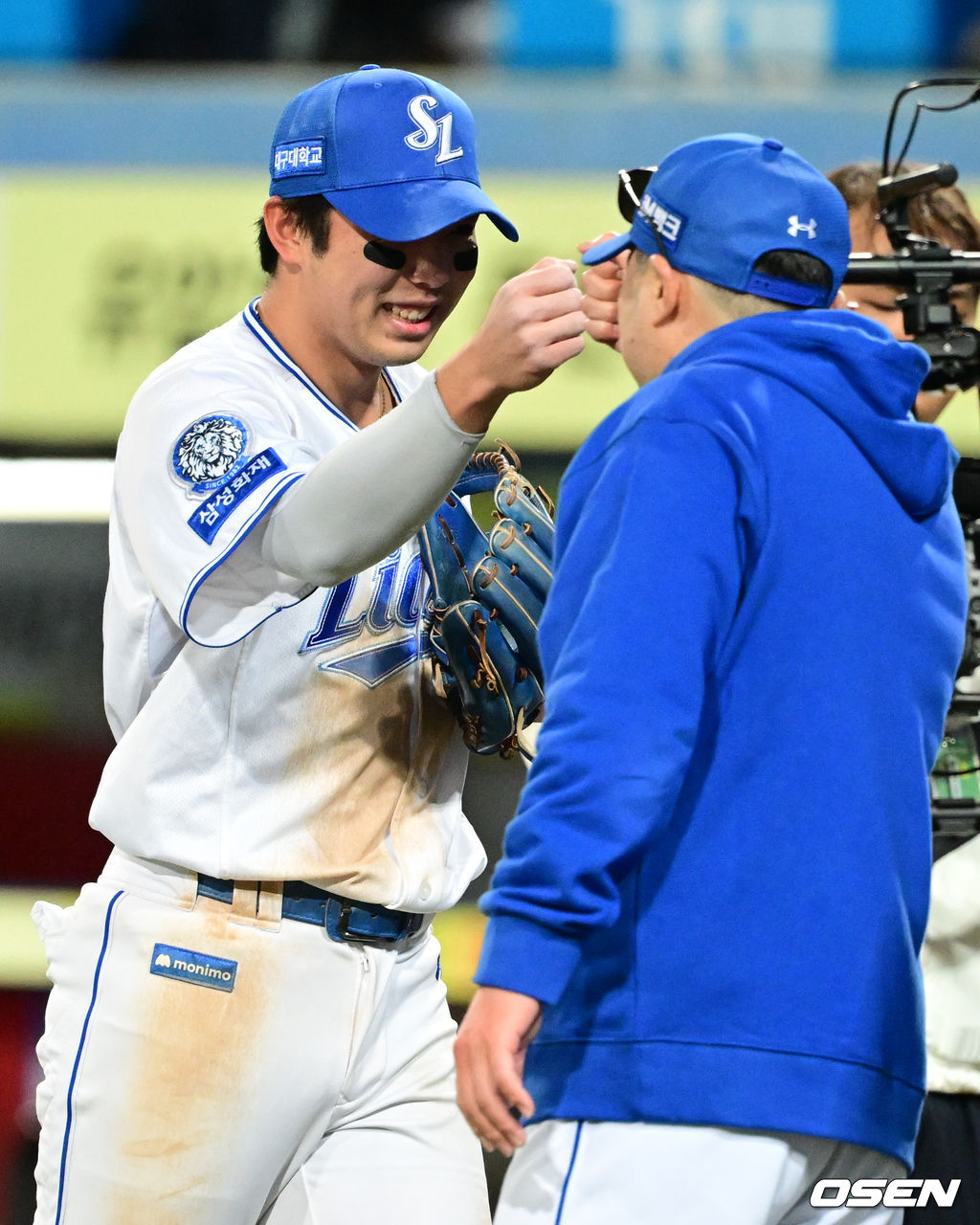 삼성 김영웅이 박진만 감독과 승리를 기뻐하고 있다. 2025.10.22 /cej@osen.co.kr