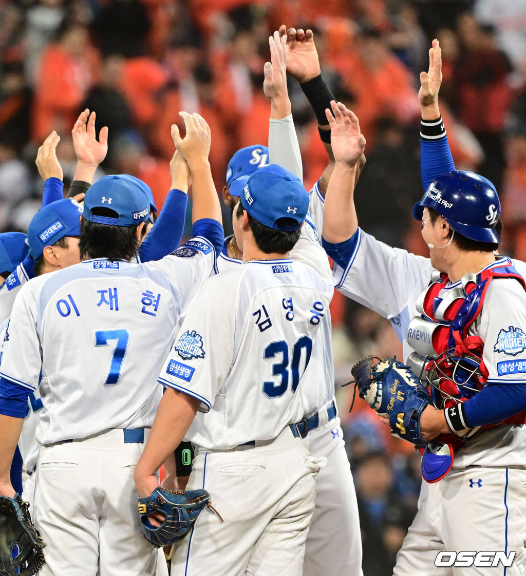 삼성이 승리를 기뻐하고 있다. 2025.10.22 /cej@osen.co.kr