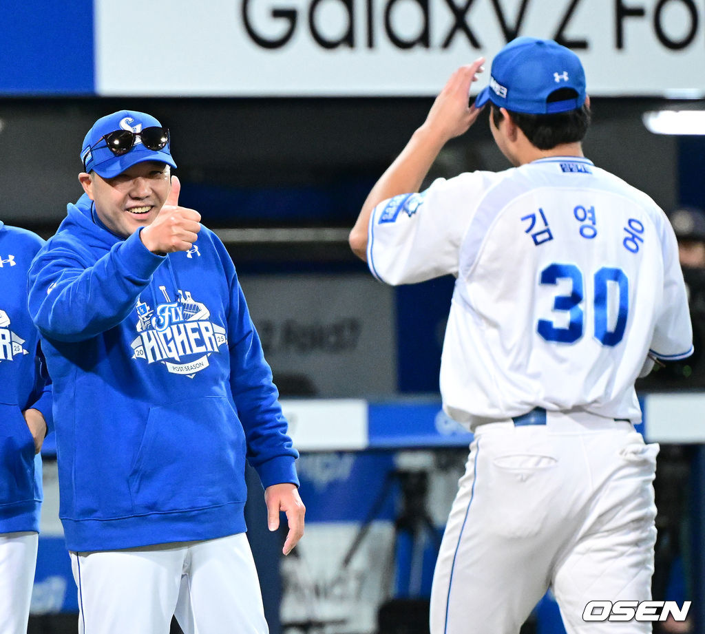 경기를 마치고 승리한 삼성 박진만 감독과 김영웅이 인사를 나누고 있다. 2025.10.22 / dreamer@osen.co.kr