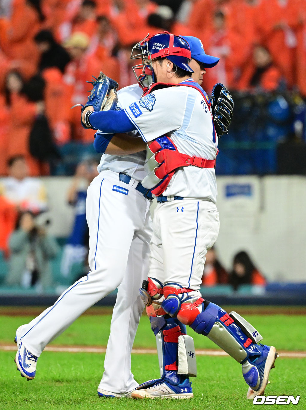 삼성 김재윤, 강민호가 승리를 기뻐하고 있다. 2025.10.22 /cej@osen.co.kr