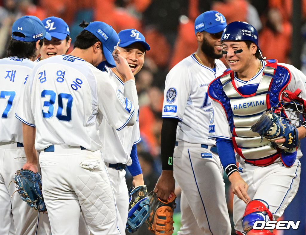삼성이 김영웅과 승리를 기뻐하고 있다. 2025.10.22 /cej@osen.co.kr