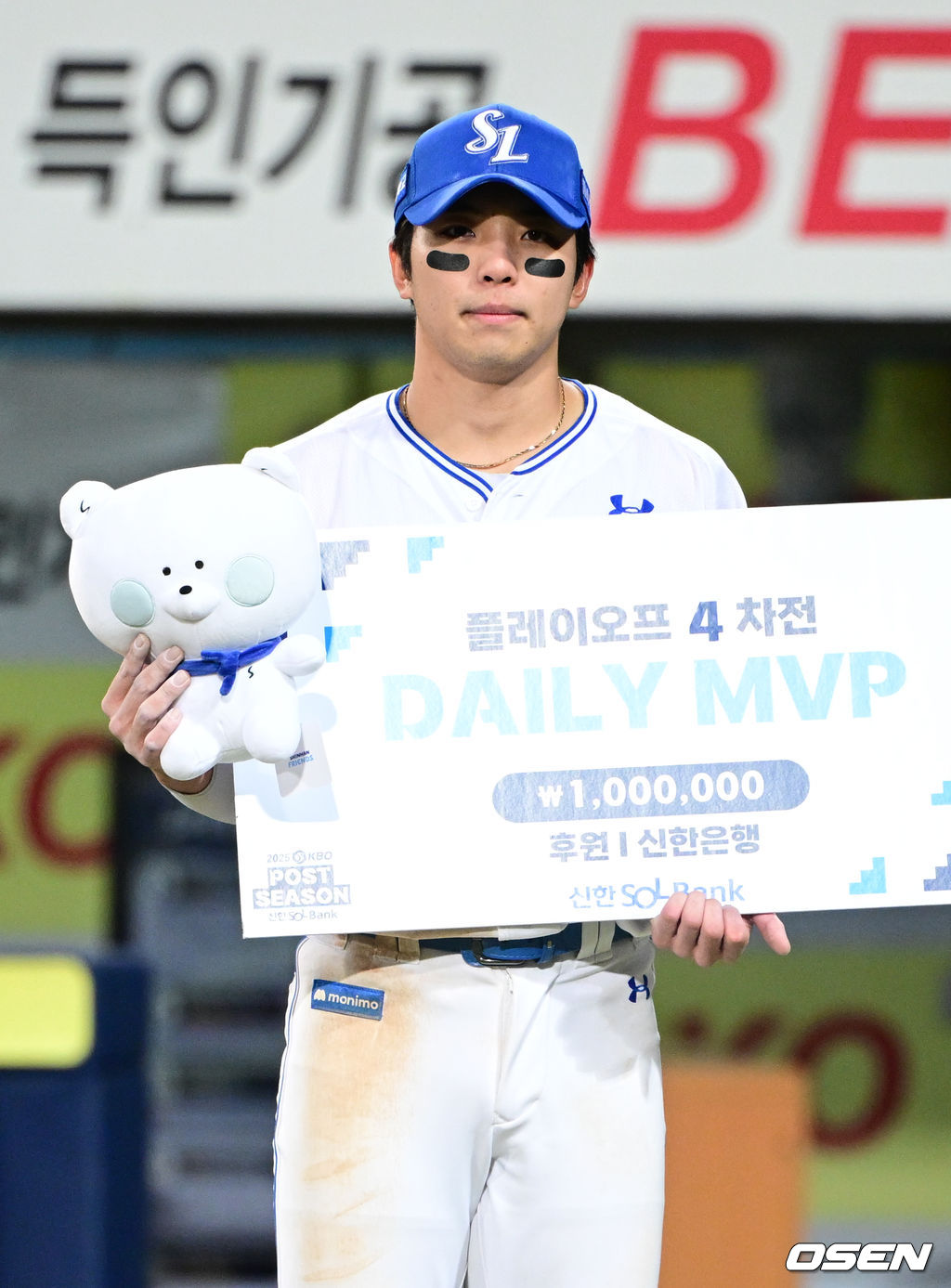 삼성 김영웅이 플레이오프 4차전 데일리 MVP를 차지한 뒤 포즈를 취하고 있다. 2025.10.22 /cej@osen.co.kr