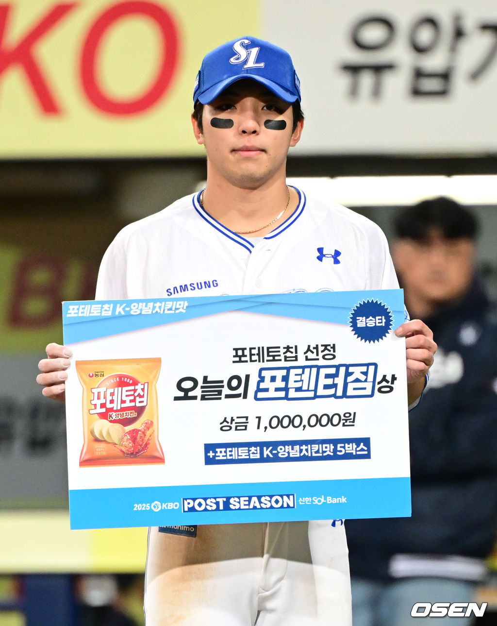삼성 김영웅이 플레이오프 4차전 오늘의 포텐터짐상을 차지한 뒤 포즈를 취하고 있다. 2025.10.22 /cej@osen.co.kr