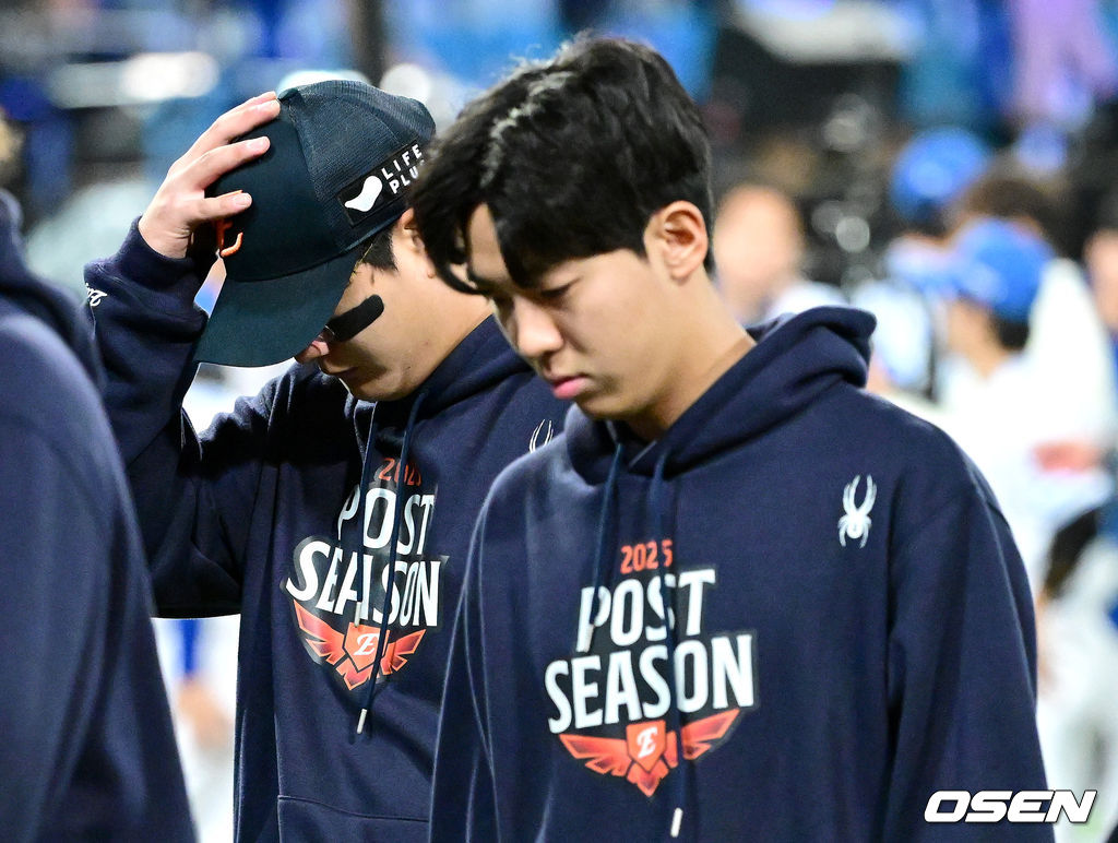 경기를 마치고 한화 김서현-황준서를 비롯한 선수들이 팬들에게 인사한 뒤 그라운드를 나서고 있다. 2025.10.22 / dreamer@osen.co.kr