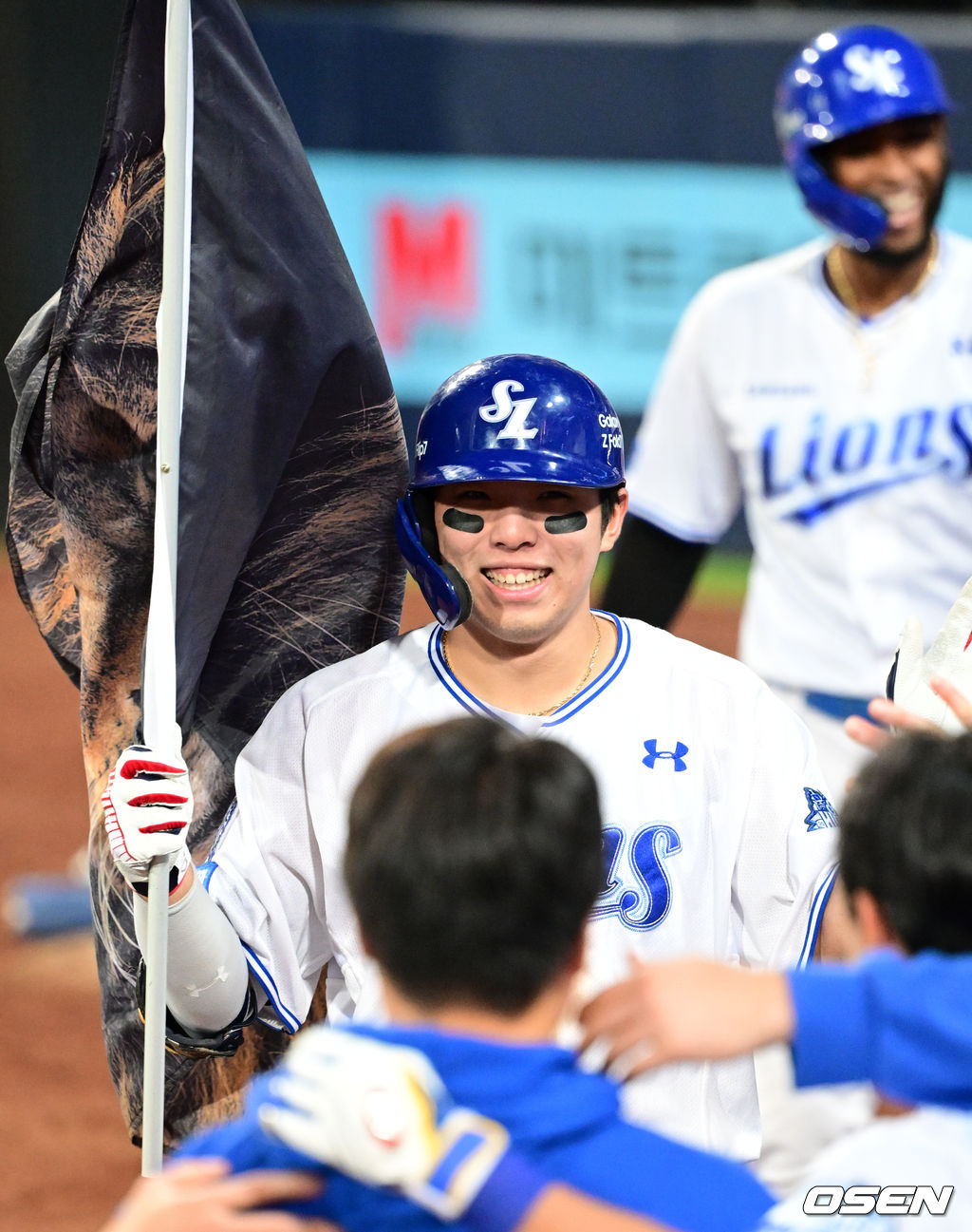 7회말 1사 1,2루 삼성 김영웅이 역전 3점 홈런을 날린 뒤 더그아웃에서 축하를 받고 있다. 6회 동점 3점 홈런에 이은 멀티 홈런. 2025.10.22 /cej@osen.co.kr
