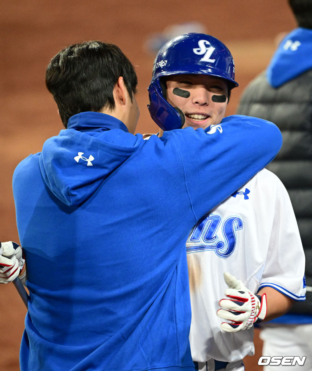 7회말 1사 1,2루 삼성 김영웅이 역전 3점 홈런을 날린 뒤 원태인의 축하를 받고 있다. 6회 동점 3점 홈런에 이은 멀티 홈런. 2025.10.22 /cej@osen.co.kr