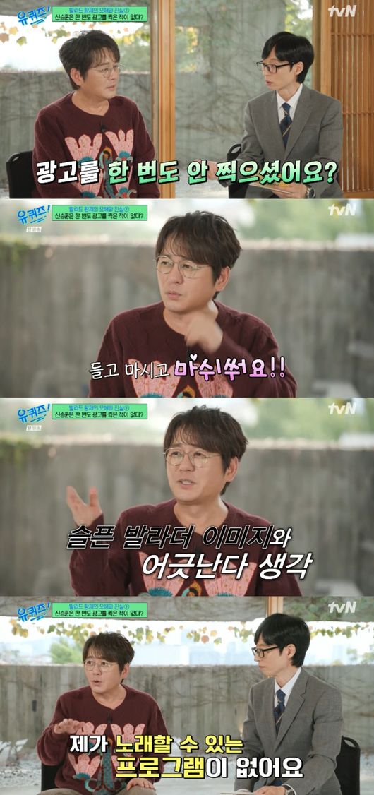 무엇보다 신승훈은 데뷔 후 35년 동안 광고를 한 번도 찍은 적이 없다고 밝혀 모두를 놀라게 했다. 그는 “그 당시에는 직접 광고가 많았다. 예를 들면 ‘1L짜리 음료수면 이거 들고 마시고 ‘맛있어요’ 해야 한다. 저는 슬픈 발라더 이미지와 매칭이 안됐다”라고 털어놨다.
