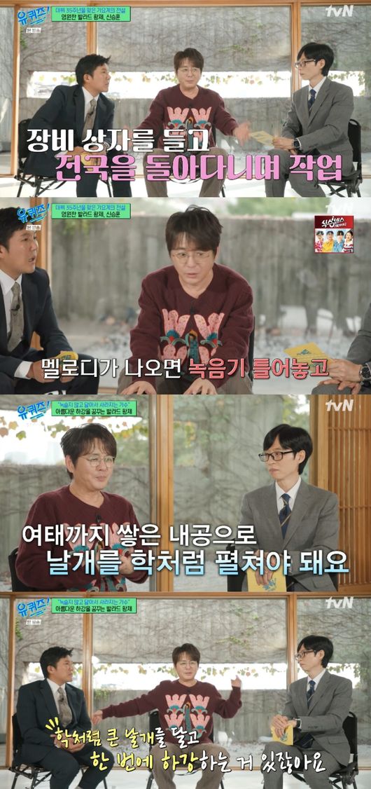 또 신승훈은 명곡을 만들기 위해 전국 팔도를 돌아다닌다고. 그는 “팔돠지는 아니고 육도 정도”라며 “장비 상자를 들고 전국 돌아다니며 작업했다”라고 말했다.