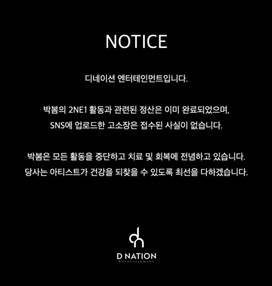 23일 소속사 디네이션 엔터테인먼트는 공식 SNS를 통해 “박봄의 2NE1 활동과 관련된 정산은 이미 완료되었으며, SNS에 업로드한 고소장은 접수된 사실이 없다”고 밝혔다.