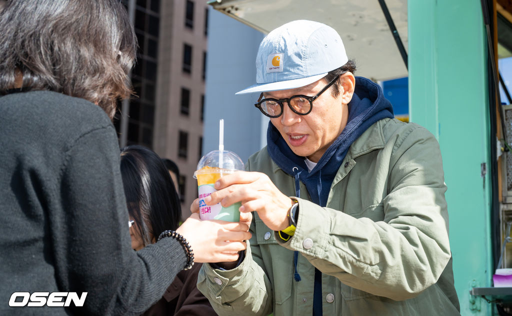배우 박지환이 팬에게 음료를 전달하고 있다. 2025.10.23 / soul1014@osen.co.kr