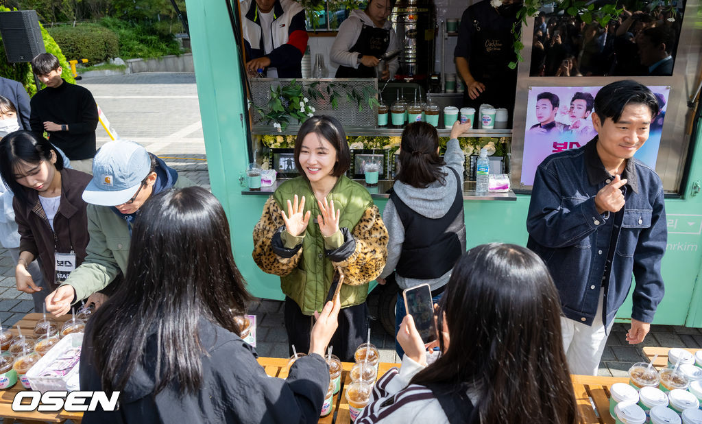 배우 박지환과 황우슬혜, 조우진이 팬들에게 커피를 전달하고 있다 2025.10.23 / soul1014@osen.co.kr