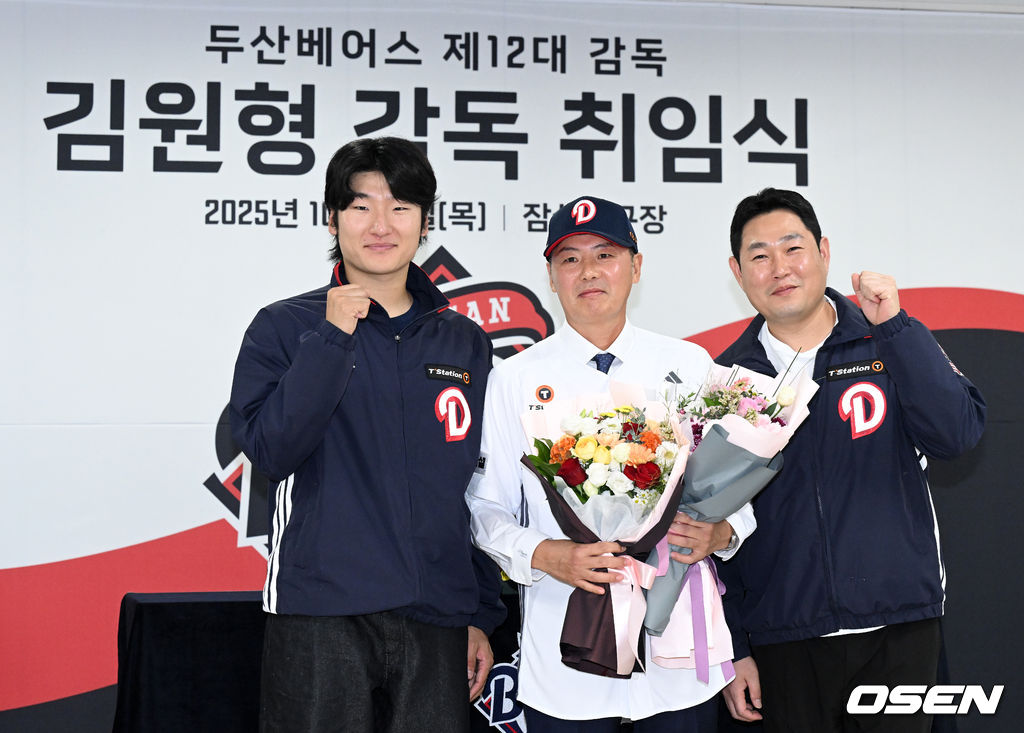 두산 김원형 감독이 곽빈, 양의지와 기념촬영을 하고 있다. 2025.10.23 /sunday@osen.co.kr