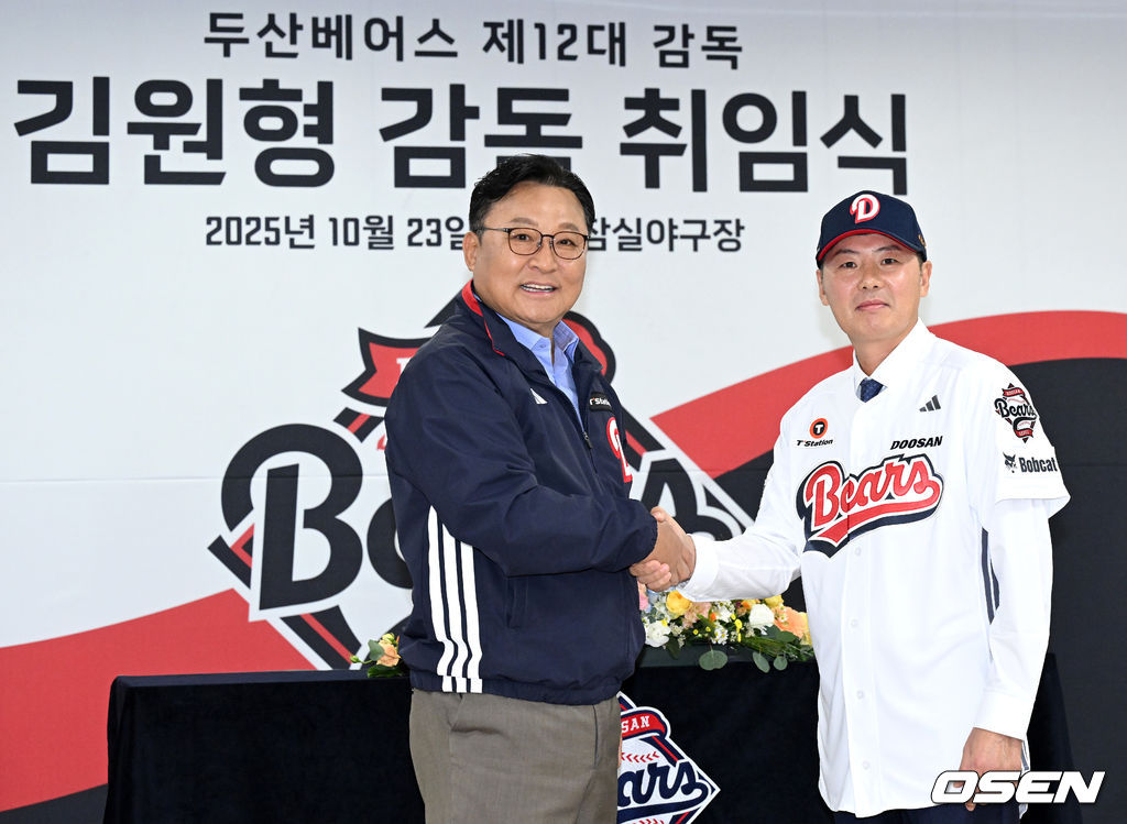 두산 고영섭 대표이사와 김원형 감독이 기념촬영을 하고 있다. 2025.10.23 /sunday@osen.co.kr