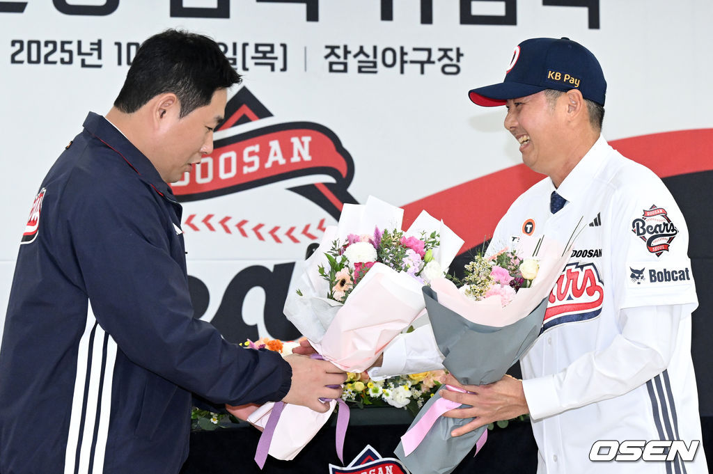 두산 양의지가 김원형 감독에게 꽃다발을 전달하고 있다. 2025.10.23 /sunday@osen.co.kr