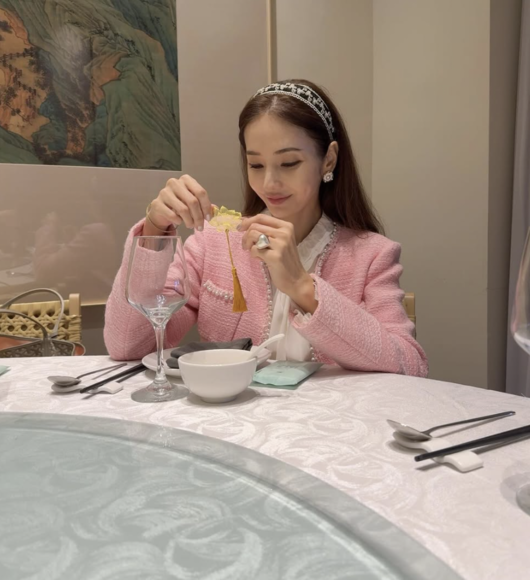 공개된 사진 속 한채영은 고급스러운 레스토랑에서 식사 중인 모습으로, 핑크 트위드 재킷과 진주 포인트 블라우스로 우아한 분위기를 자아냈다. 머리에는 헤어밴드를 착용해 고전적인 ‘바비인형 비주얼’을 완성했다.