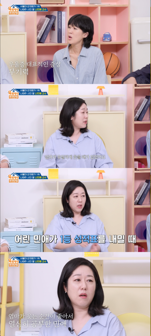 이처럼 뛰어난 학업 성취와 강의 실력을 갖춘 나 교수는 자신이 공부를 열심히 했던 이유에 대해 가슴 아픈 사연을 고백해 눈길을 끌었다. 그는 “어머니가 우울증이 있으셨는데, 유일하게 어머니가 일어나서 행복해하는 시간이 제가 1등 성적표를 가져갔을 때였다”고 밝히며, 어머니에게 기쁨을 드리기 위해 공부를 열심히 했다고 고백해 뭉클함을 안겼다.