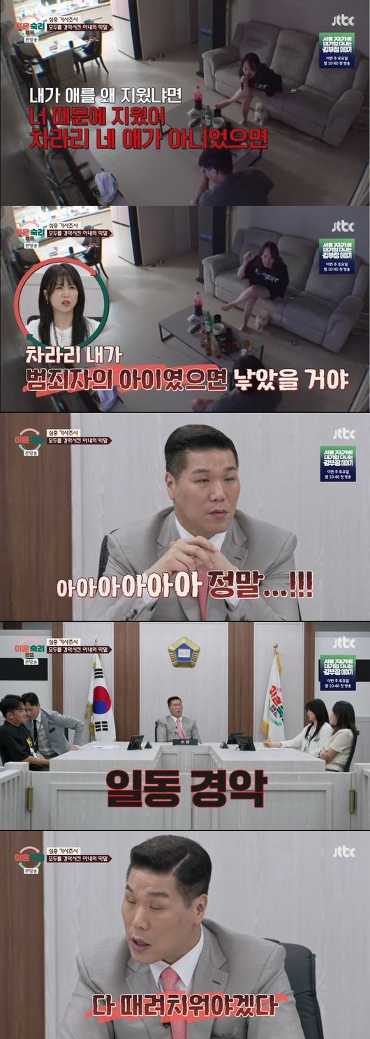 아내는 "내가 애를 왜 지웠냐면 너 때문에 지웠어. 차라리 네 애가 아니었으면. 차라리 내가 범죄자의 아이였으면 낳았을 거야. 네가 범죄자보다 못하다는 얘기야"라는 충격적인 막말을 했다.