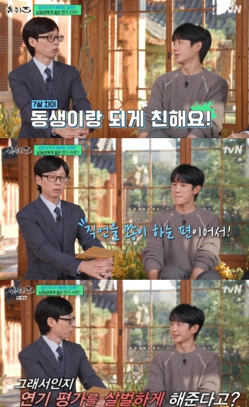 정해인은 지난해 10월 방송된 tvN '유퀴즈'에서 "7살 차 동생이랑 되게 친하다"면서도 "동생이 나에게 조언도 많이 해주고 직언을 많이 하는 편"이라며 배우 생활에 큰 도움이 됐다고 했다. 유재석이 "동생 분이 연기 평가를 살벌하게 한다고 들었다"고 묻자, "어제도 들었다. 나한테 '하관을 너무 많이 쓰는 것 같다'고 하더라"고 고백해 웃음을 자아내기도 했다.