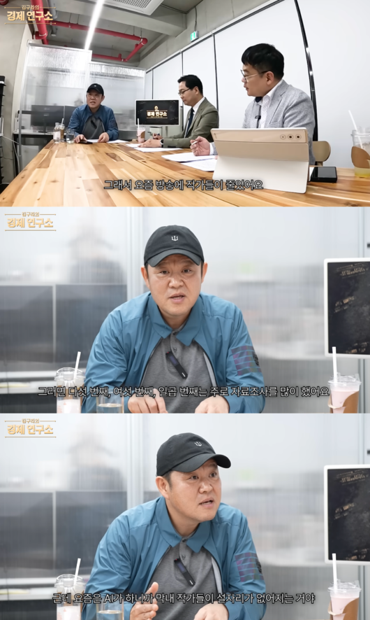 AI 때문에 방송 작가들이 줄었다고. 김구라는 “그래서 요즘 방송에 작가들이 줄었다. 왜냐하면 작가가 옛날에 7~8명 있다 치자면 그러면 다섯 번째 ,여섯 번째, 일곱 번째 작가는 주로 자료조사를 많이 했다”며 “그런데 요즘은 AI가 하니까 막내 작가들이 설자리가 없어지는 거다. AI가 사람들의 직업을 뺏는다는 게 그게 사실은 맞는 얘기이기도 하다”고 했다.