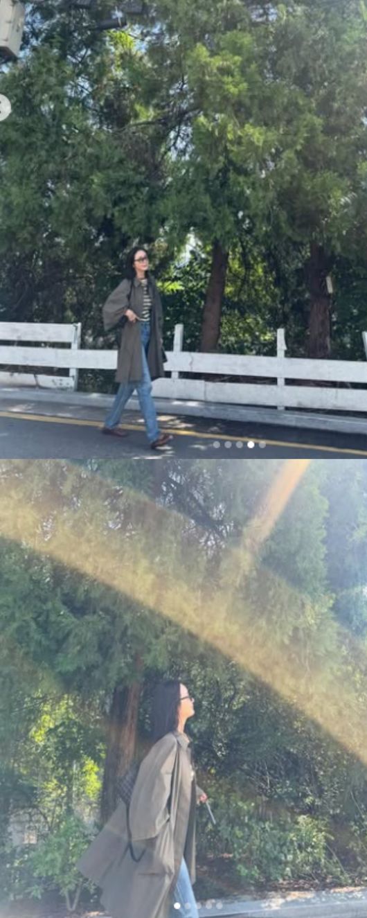 사진 속 최지우는 한적한 거리를 산책하고 있는 모습이 담겼다. 그는 청바지에 트렌치코트를 걸치고 선글라스를 착용한 모습. 바람에 머리카락을 흩날리며 영화에 한 장면을 연출했다.