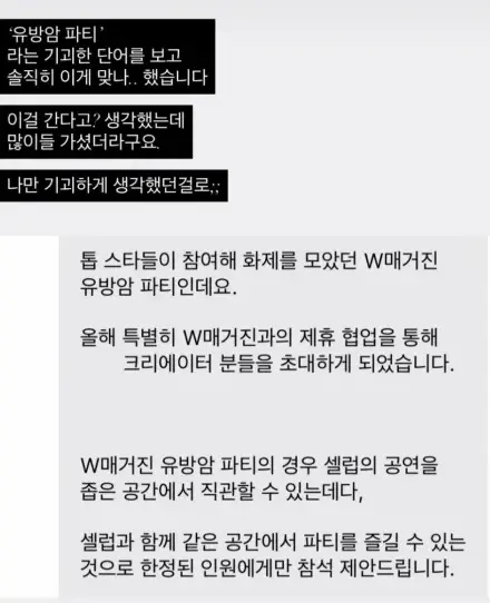 공개된 사진에는 앞서 더블유 코리아 측이 최근 진행된 유방암 검진 인식 개선 행사를 위해 문자 형식으로 배포한 초대장이 담겼다. 해당 메시지에는 '톱 스타들이 참여해 화제를 모았던 W매거진 유방암 파티'라는 문구가 적혀 비판을 자아냈다.