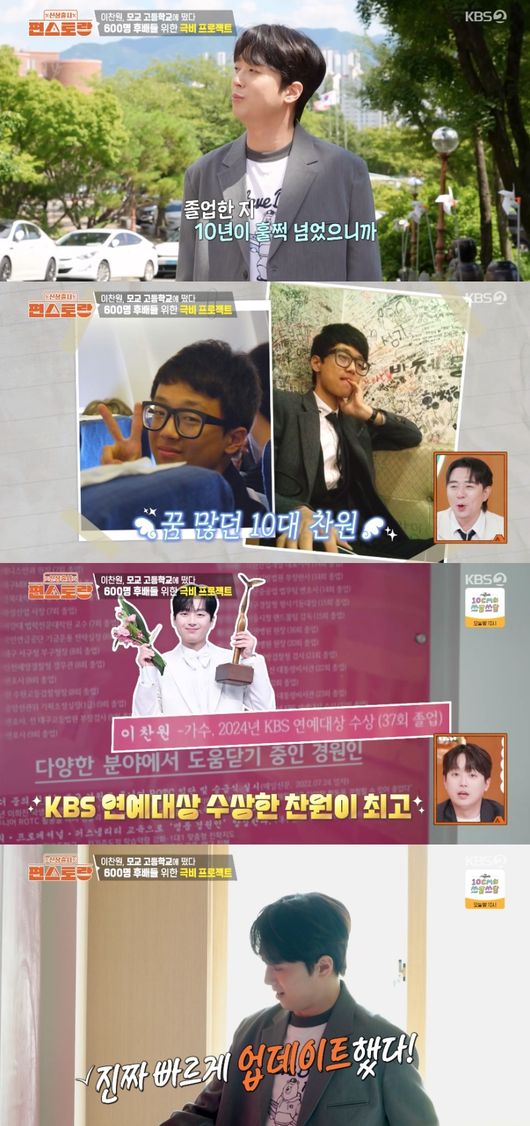 이날 모교 고등학교를 찾은 이찬원은 학창시절을 떠올리며 추억에 젖었다. 이어 학교 로비에 들어선 그는 ‘경원을 빛내는’ 명단에서 자신의 이름을 발견하고 “대박”이라고 외쳤다.