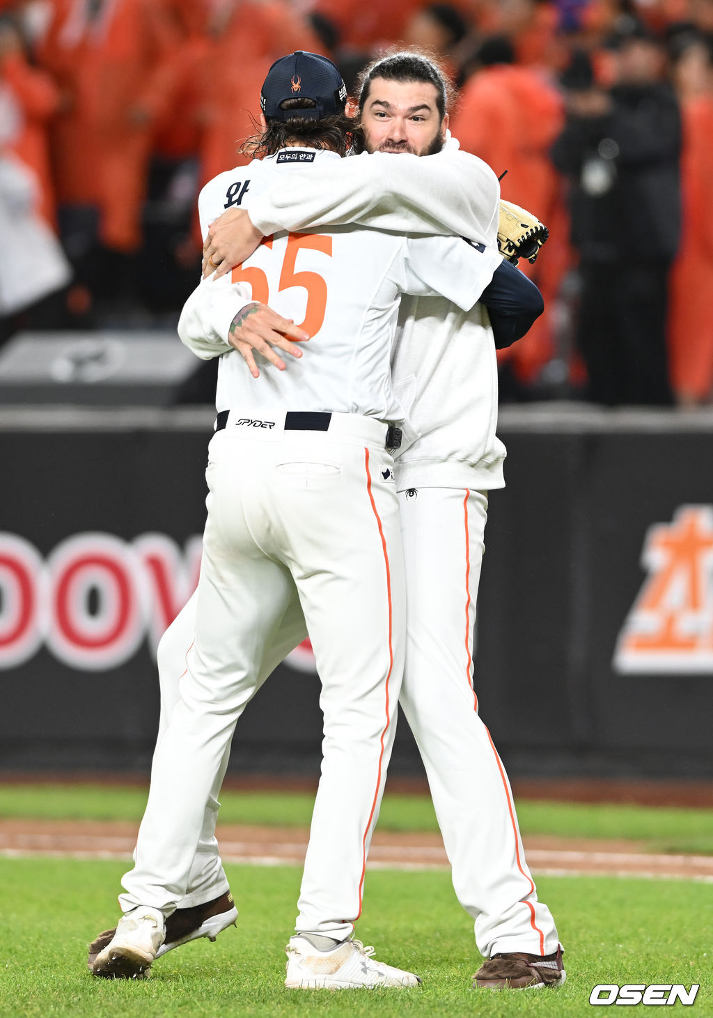 폰세와 와이스가 합작해서 승리를 이끌어 한국시리즈 진출을 이뤄낸 후 포옹을 하고 있다. 2025.10.24 /spjj@osen.co.kr
