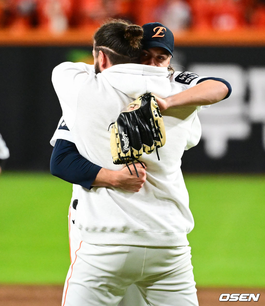 경기를 마치고 한화 와이스, 폰세가 포옹을 하며 승리를 기뻐하고 있다. 2025.10.24 /jpnews@osen.co.kr