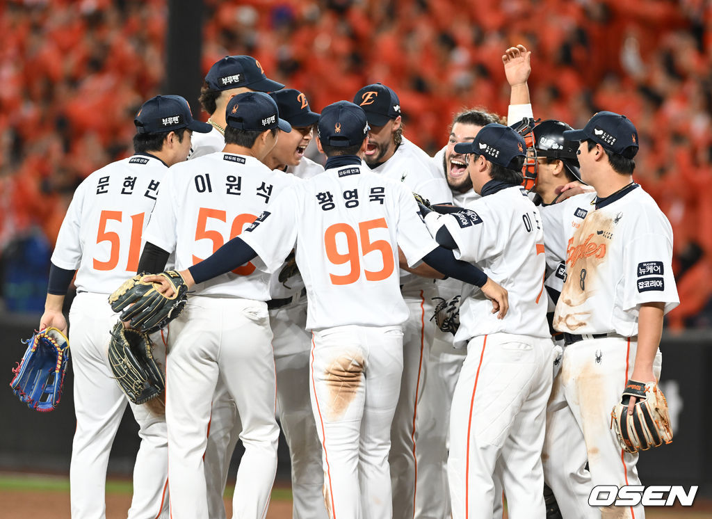 선수들이 마운드에 모여 승리의 기쁨을 나누고 있다. 2025.10.24 /spjj@osen.co.kr