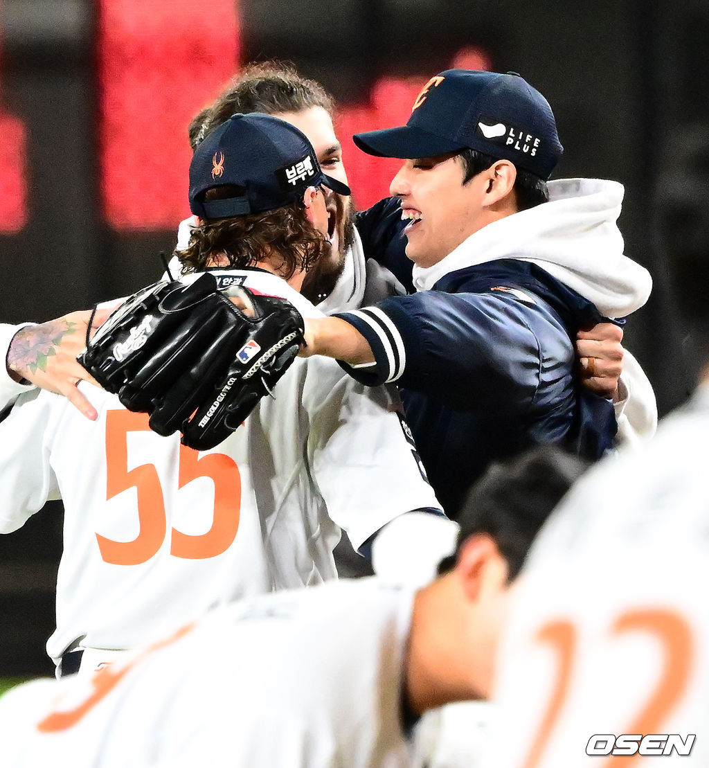 경기를 마치고 한화 와이스, 폰세, 문동주가 포옹을 하며 승리를 기뻐하고 있다. 2025.10.24 /jpnews@osen.co.kr