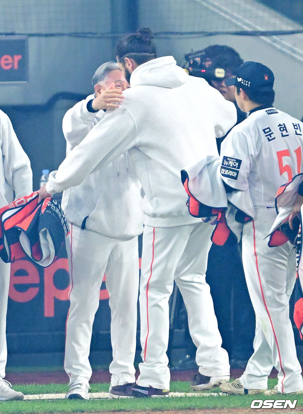 경기를 마치고 승리한 한화 김경문 감독과 폰세가 기뻐하고 있다. 2025.10.24 / dreamer@osen.co.kr
