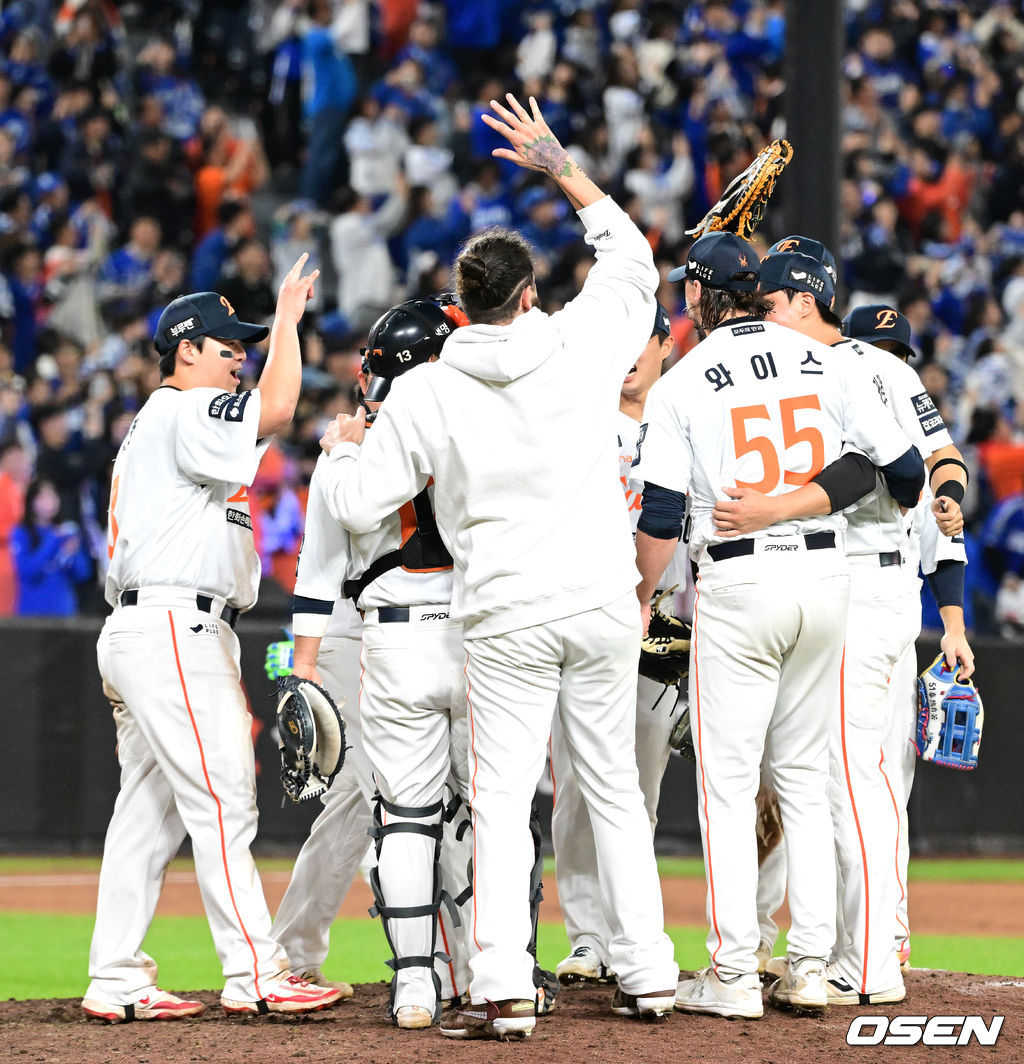 경기 종료 후 한화 선수들이 승리의 기쁨을 나누고 있다. 2025.10.24 /sunday@osen.co.kr