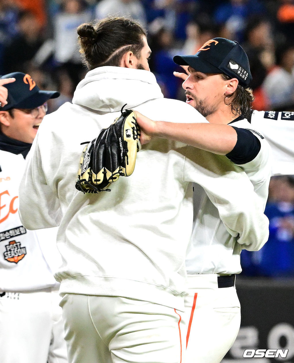 경기 종료 후 한화 와이스가 폰세와 환호하고 있다. 2025.10.24 /sunday@osen.co.kr