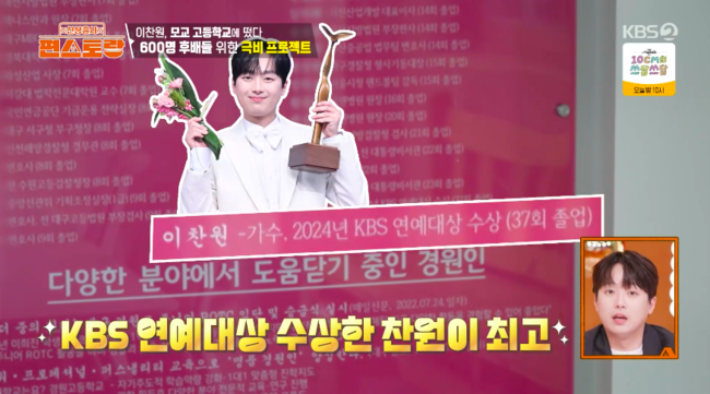 명단 맨 아래에는 ‘이찬원-가수, 2024년 KBS 연예대상 수상 (37회 졸업)’이라고 적혀있었다. 이를 본 이찬원은 “진짜 빠르게 업데이트 했다. 진짜 빠르다”라고 놀라움을 감추지 못했다.