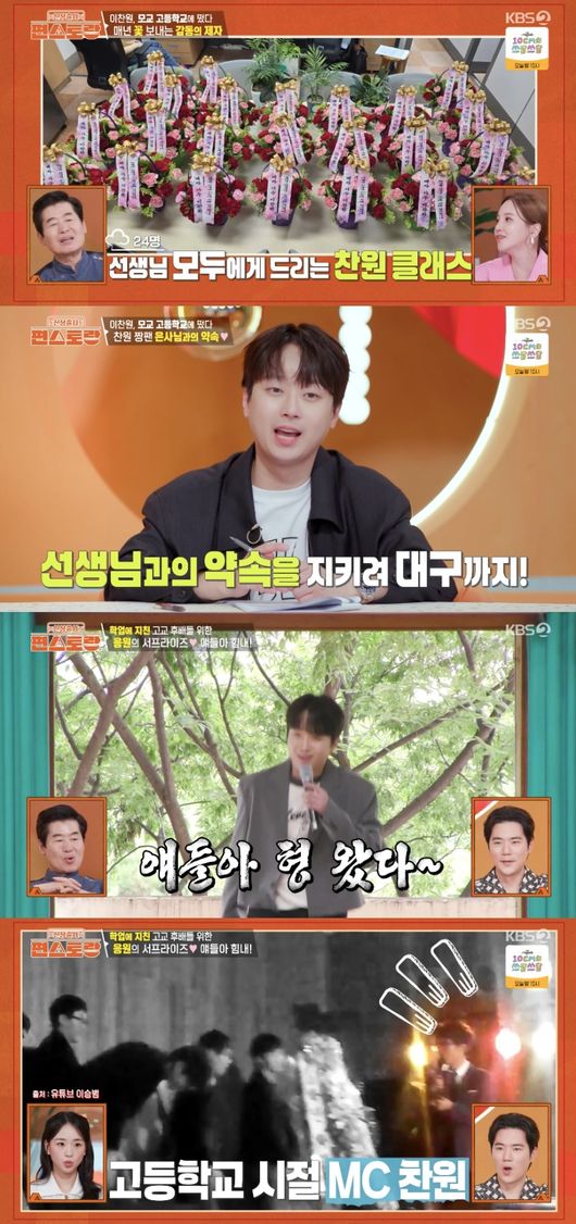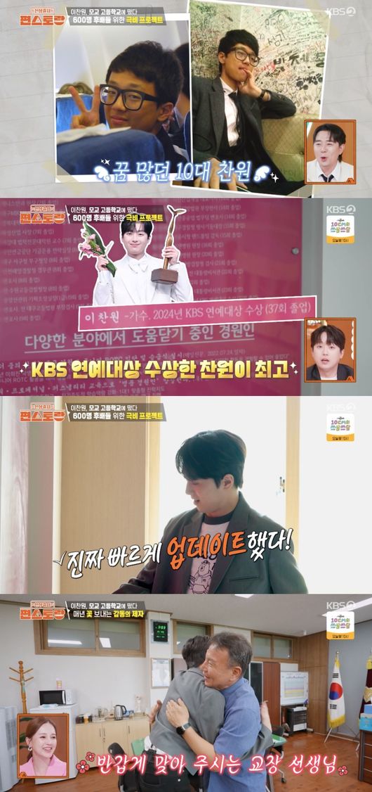 학교에 들어서자마자 이찬원은 가장 먼저 교장실을 방문했다. 환한 미소로 반긴 교장선생님은 “매년 네가 선생님들 잊지 않고 꽃도 보내줘서”라며 매년 24명의 선생님께 스승의 날을 맞아 꽃 선물을 보내고 있다고 미담을 전했다.