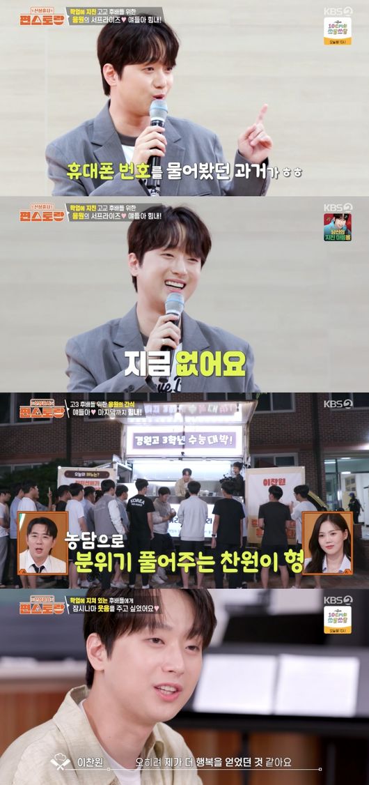또 이찬원은 후배들과의 질의응답 시간을 가졌다. 이때 한 학생은 “여자친구 사귀는 법 알려주세요”라고 물었고, 이찬원은 “저는 학창시절에 축제 하면 여고생들 오지 않냐, 저는 항상 여기서 사회를 봤다. MC 보고 내려가면 2~3명 여고생이 저한테 휴대폰 번호 물어봤다”라고 너스레를 떨었다.