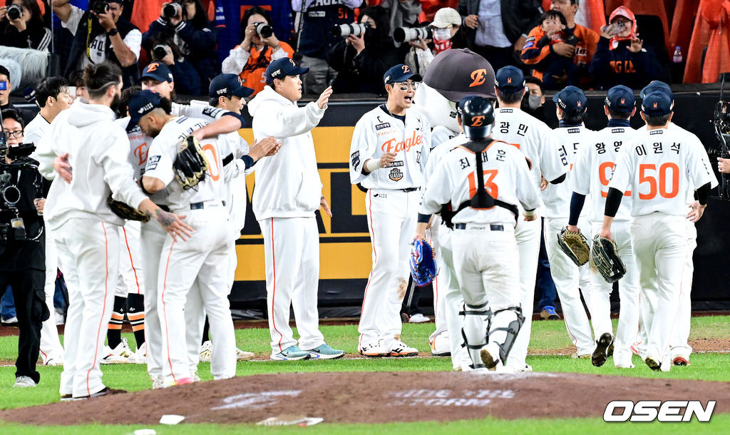 경기를 마치고 승리한 한화 코칭스태프 및 선수들이 기뻐하고 있다. 2025.10.24 / dreamer@osen.co.kr