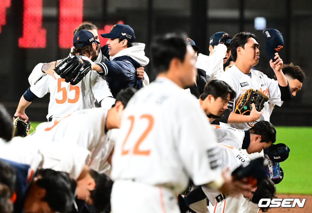 경기를 마치고 한화 와이스, 폰세, 문동주가 포옹을 하며 승리를 기뻐하고 있다. 2025.10.24 /jpnews@osen.co.kr