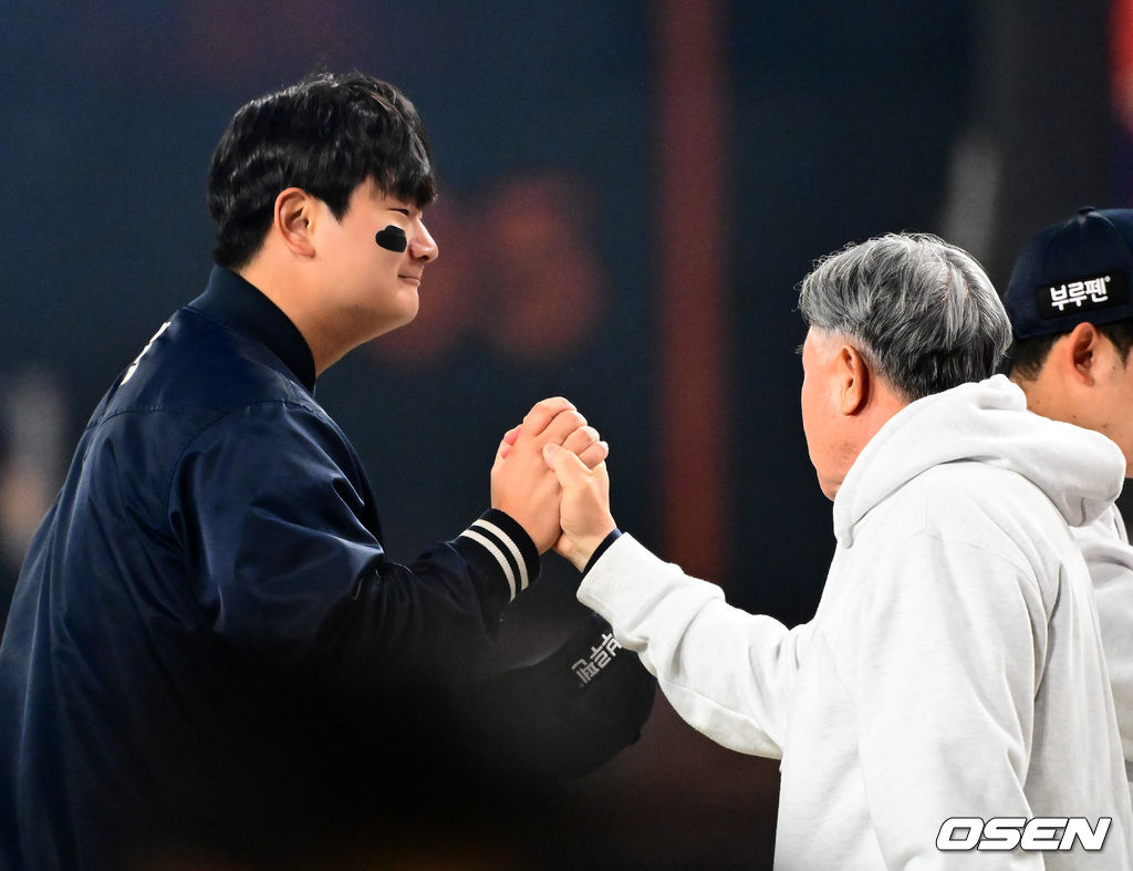 경기를 마치고 한화 김경문 감독이 김서현과 하이파이브를 하며 승리를 기뻐하고 있다. 2025.10.24 /jpnews@osen.co.kr