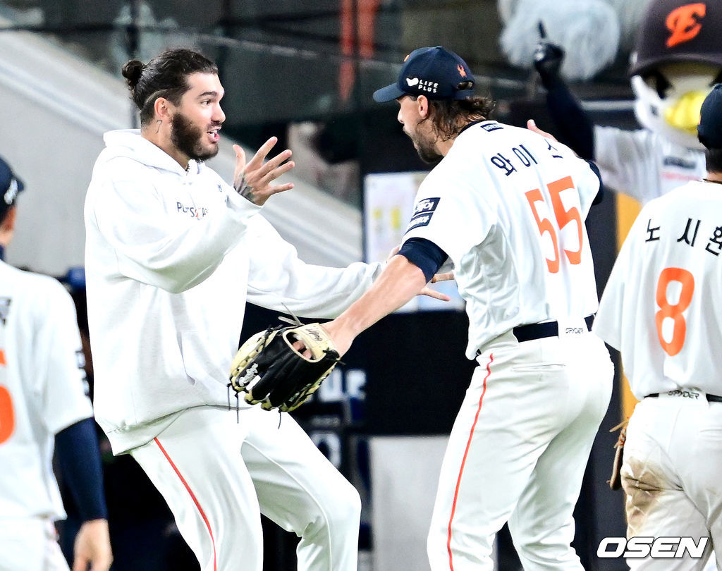 경기를 마치고 승리한 한화 폰세와 와이스가 기뻐하고 있다. 2025.10.24 / dreamer@osen.co.kr
