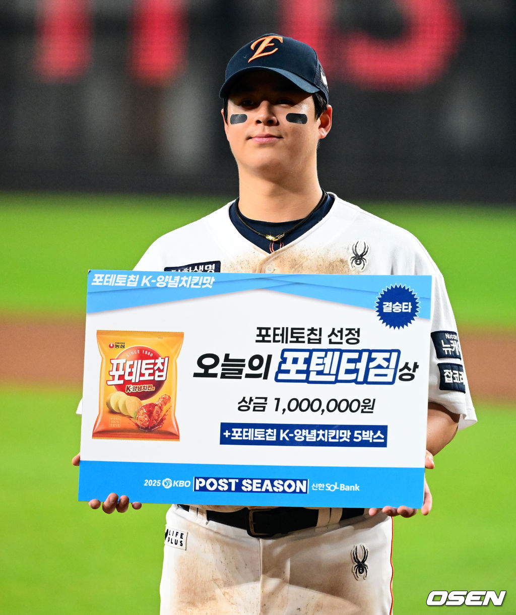 경기를 마치고 한화 노시환이 '오늘의 포텐터짐 상'을 수상하며 포즈를 취하고 있다. 2025.10.24 /jpnews@osen.co.kr