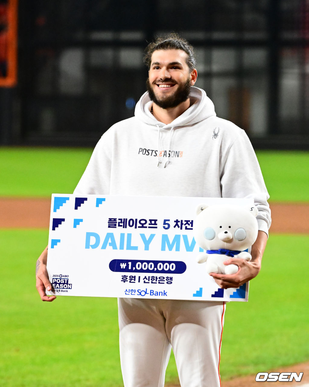 경기를 마치고 한화 폰세가 플레이오프 5차전 MVP에 선정되며 포즈를 취하고 있다. 2025.10.24 /jpnews@osen.co.kr
