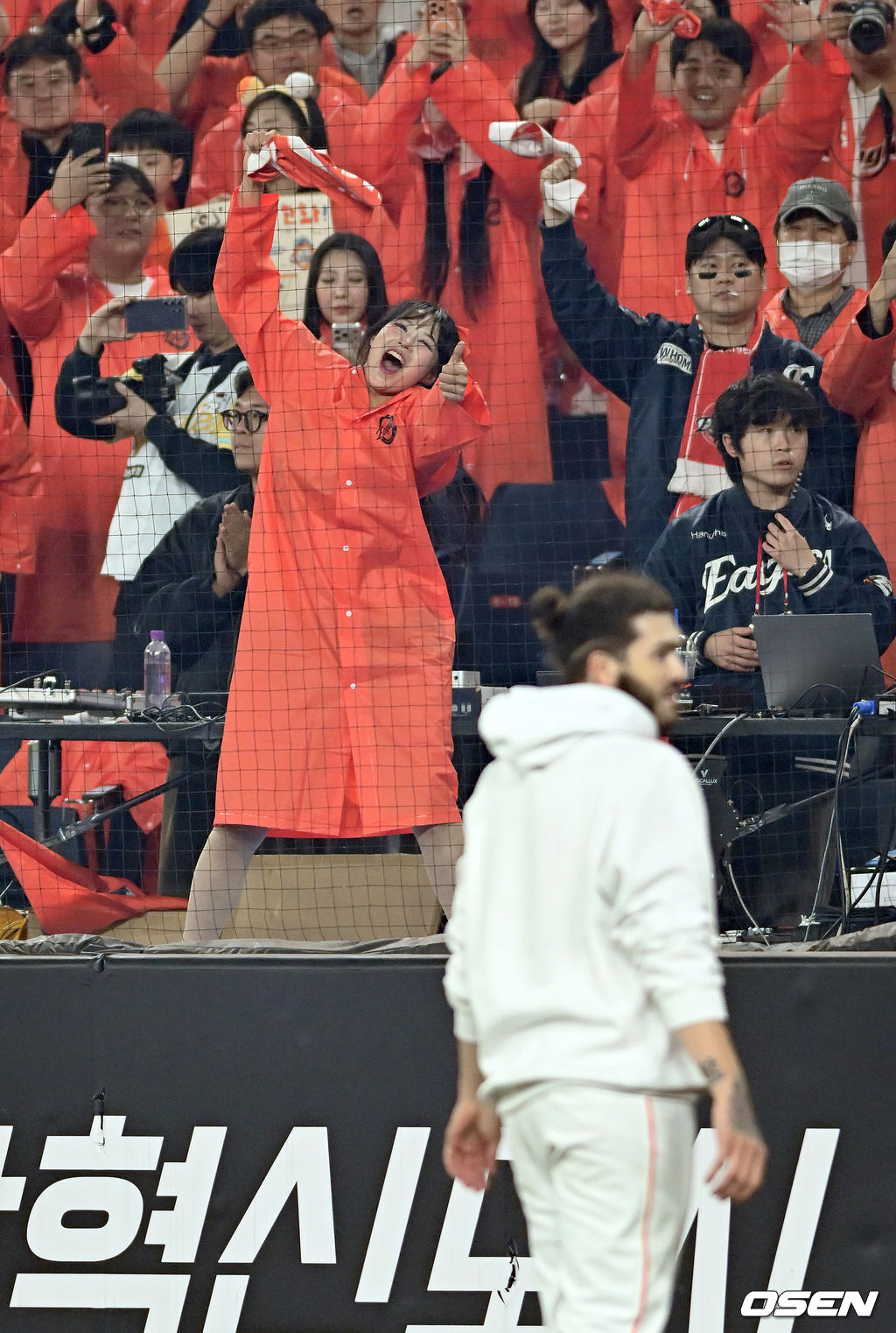 한화 치어리더가 폰세에게 엄지척을 날리고 있다. 2025.10.24 /spjj@osen.co.kr