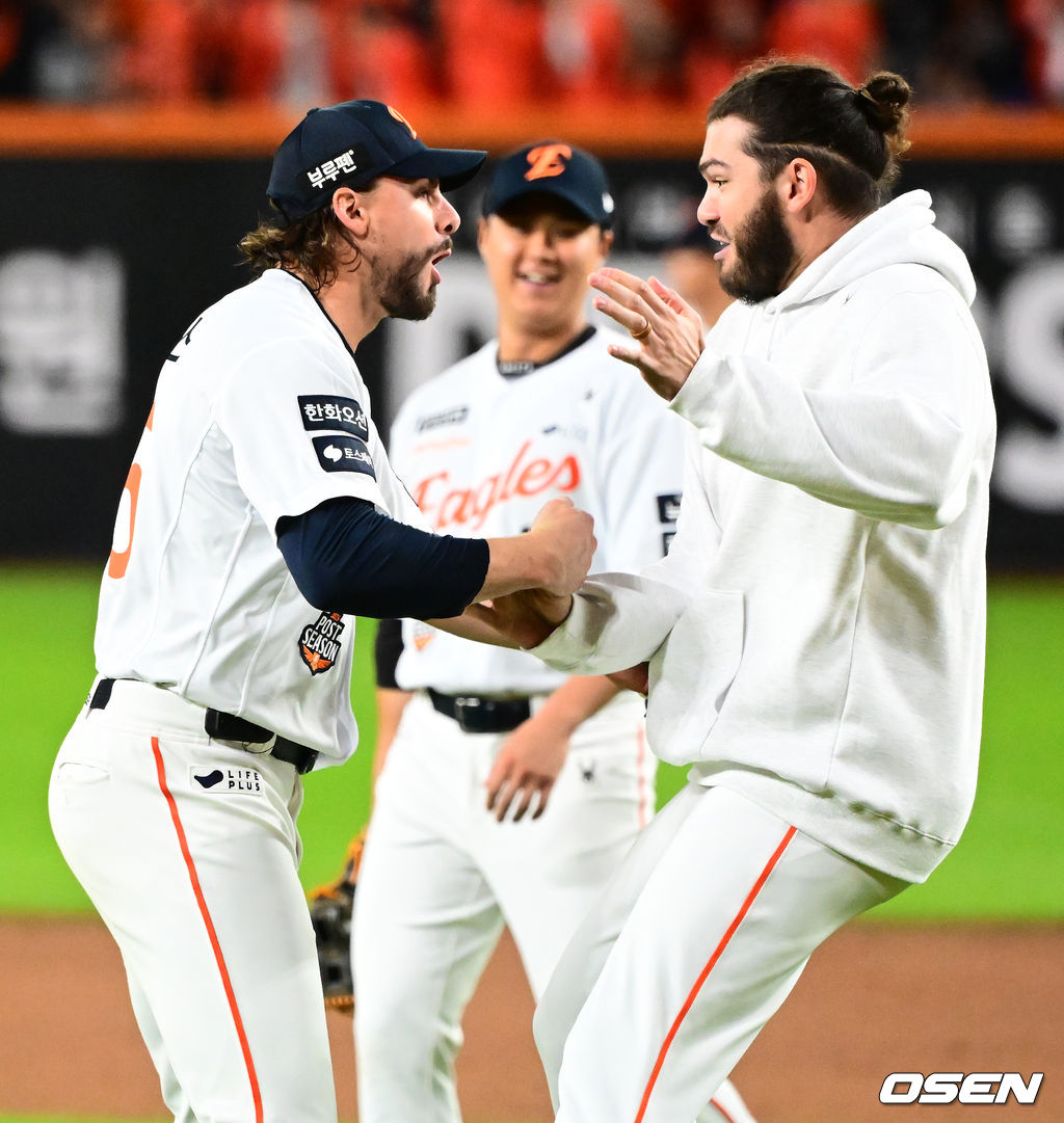경기를 마치고 한화 와이스, 폰세가 승리를 기뻐하고 있다. 2025.10.24 /jpnews@osen.co.kr