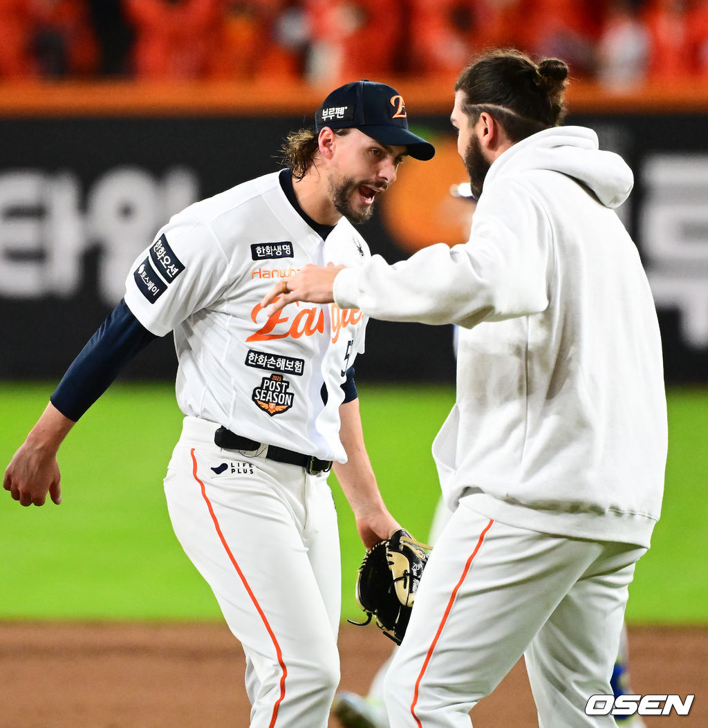 경기를 마치고 한화 와이스, 폰세가 승리를 기뻐하고 있다. 2025.10.24 /jpnews@osen.co.kr